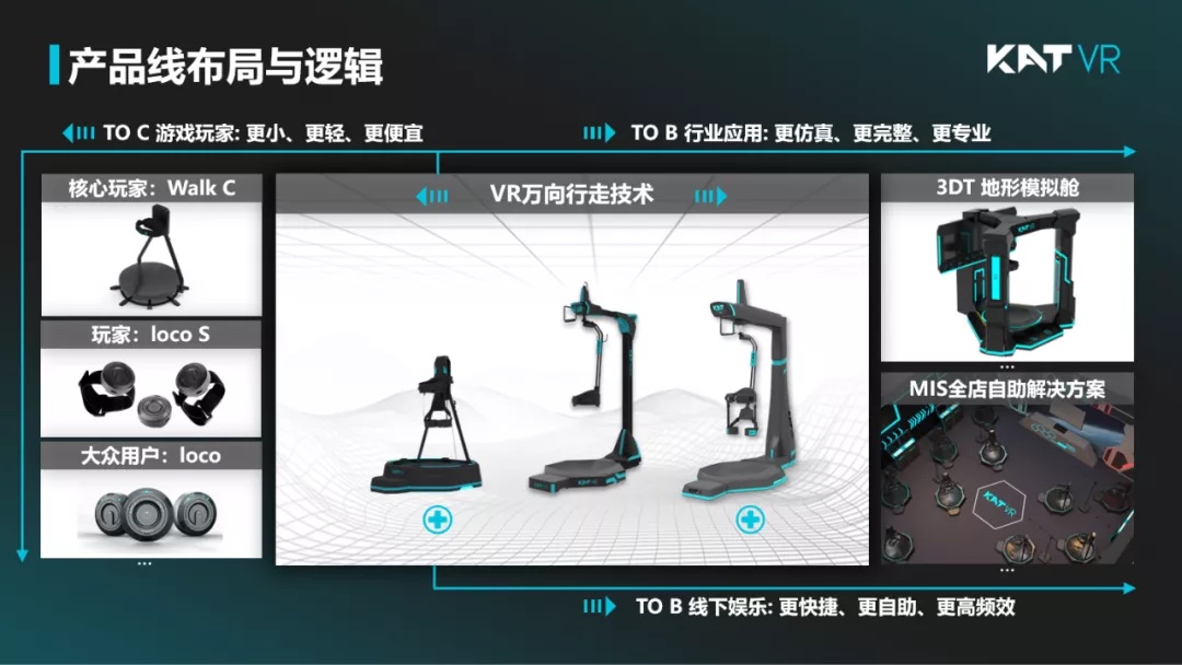 KATVR根据VR跑步机技能打开产品线,三大中心事务版块分别为:TOC游戏玩家商场、TOB职业使用商场和线下文娱商场。