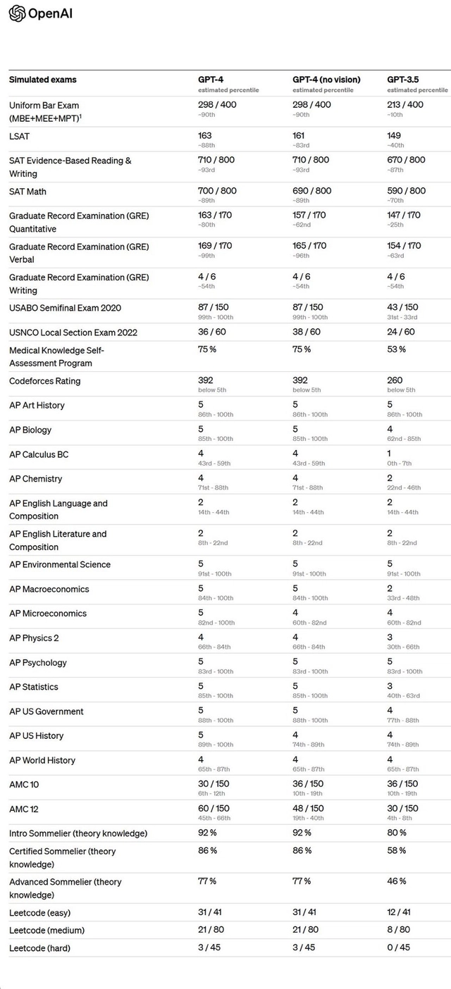 尽管在许多实践场景中AI仍不如人类,但GPT-4在许多专业和学术基准上都出现了人类水平的体现。以美国 BAR律师执照统考为例,GPT3.5能够到达 10%水平,GPT-4能够到达90%水平。在 GPT-3.5 版别模型下,它的 SAT 成果只能排倒数 10% 的水平,可是 GPT-4 模型能够逾越 90% 考生的水平。假如仅以分数作为衡量,GPT-4 现已差不多到达了美国顶尖名校的入学规范。